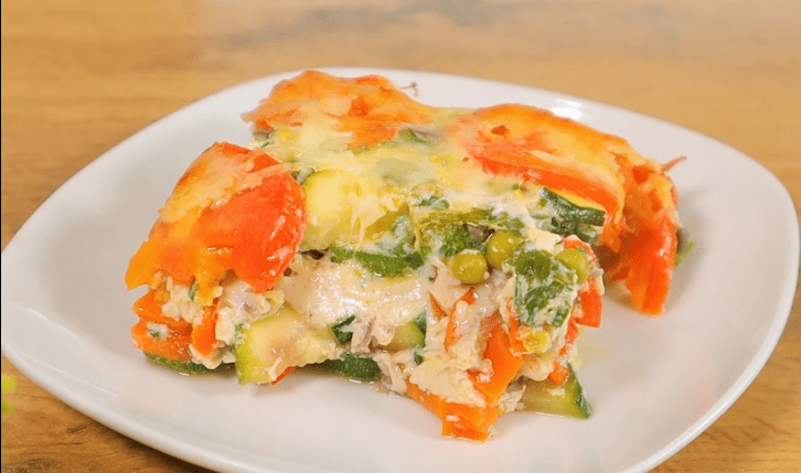 Amalgama il composto di uova sbattute alle verdure e trasferisci tutto in una teglia da forno.