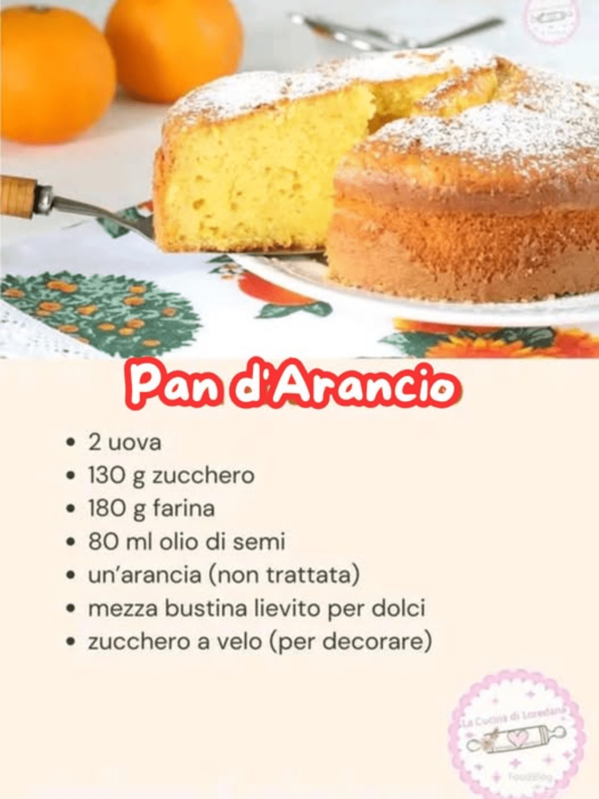 La torta viene cotta in forno a 180°C per circa 40 minuti, e una volta raffreddata, viene decorata con una spolverata di zucchero a velo, che la rende ancora più invitante. Il Pan d’Arancio è ideale per una colazione dolce o una merenda accompagnata da una tazza di tè, ma anche come dessert leggero e fresco per ogni occasione. Il suo profumo di agrumi e la sua consistenza soffice la rendono irresistibile!