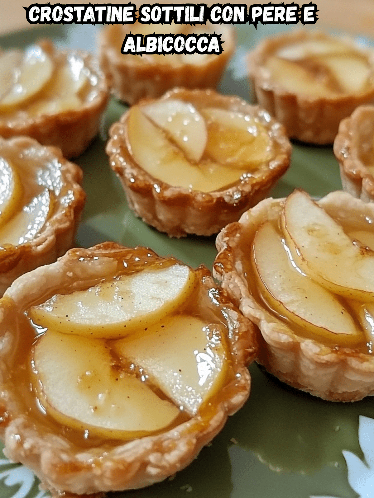 Deliziose e raffinate, queste crostatine sottili uniscono la dolcezza delle pere mature al gusto fruttato della confettura di albicocche. La base croccante di pasta brisée e la leggera doratura del burro completano un dessert elegante e facile da preparare, perfetto per un tè pomeridiano, un fine pasto leggero o una merenda fatta in casa.