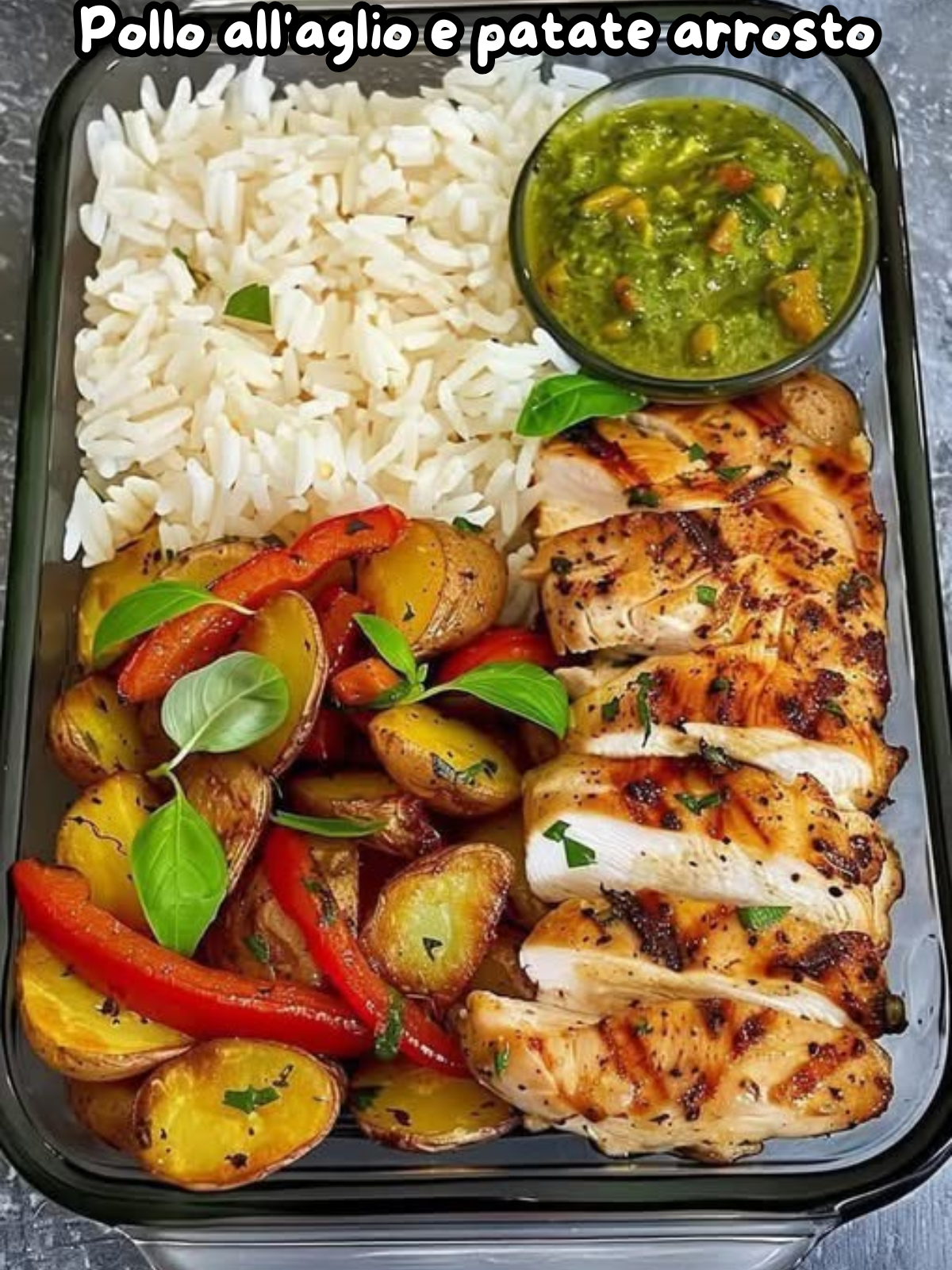 Un piatto completo e confortante, ricco di erbe aromatiche e sapori freschi. Filetti di pollo succosi all’aglio e origano, patate arrosto croccanti e riso profumato alle erbe sono uniti da una cremosa e saporita salsa al pesto di basilico e yogurt. Una combinazione perfetta per un pasto equilibrato e ricco di gusto.