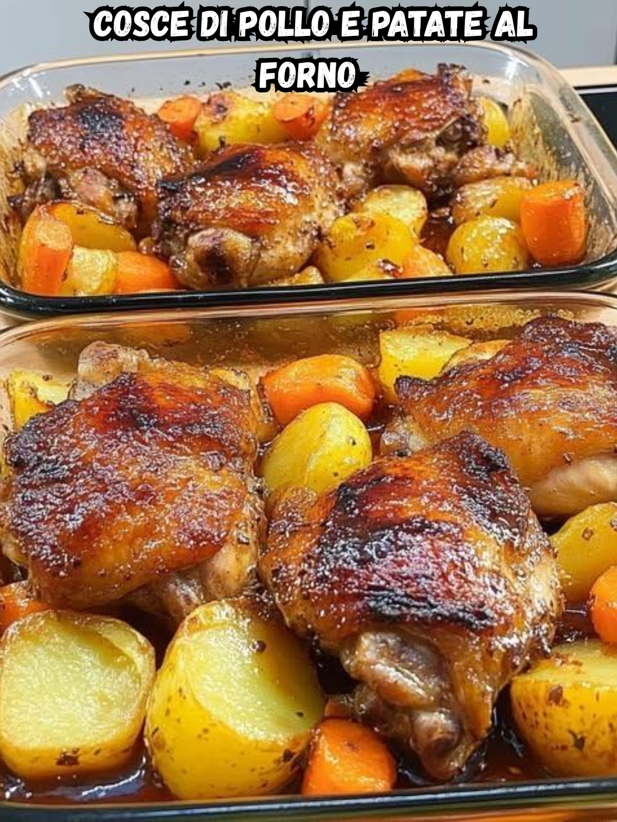 Un piatto unico, rustico e deliziosamente confortante: le cosce di pollo vengono cotte al forno fino a diventare dorate e croccanti, adagiate su un letto di patate e carote tenere. Il tutto è avvolto in una glassa dolce e saporita a base di burro, miele e salsa chili dolce. Perfetto per una cena semplice ma ricca di gusto.