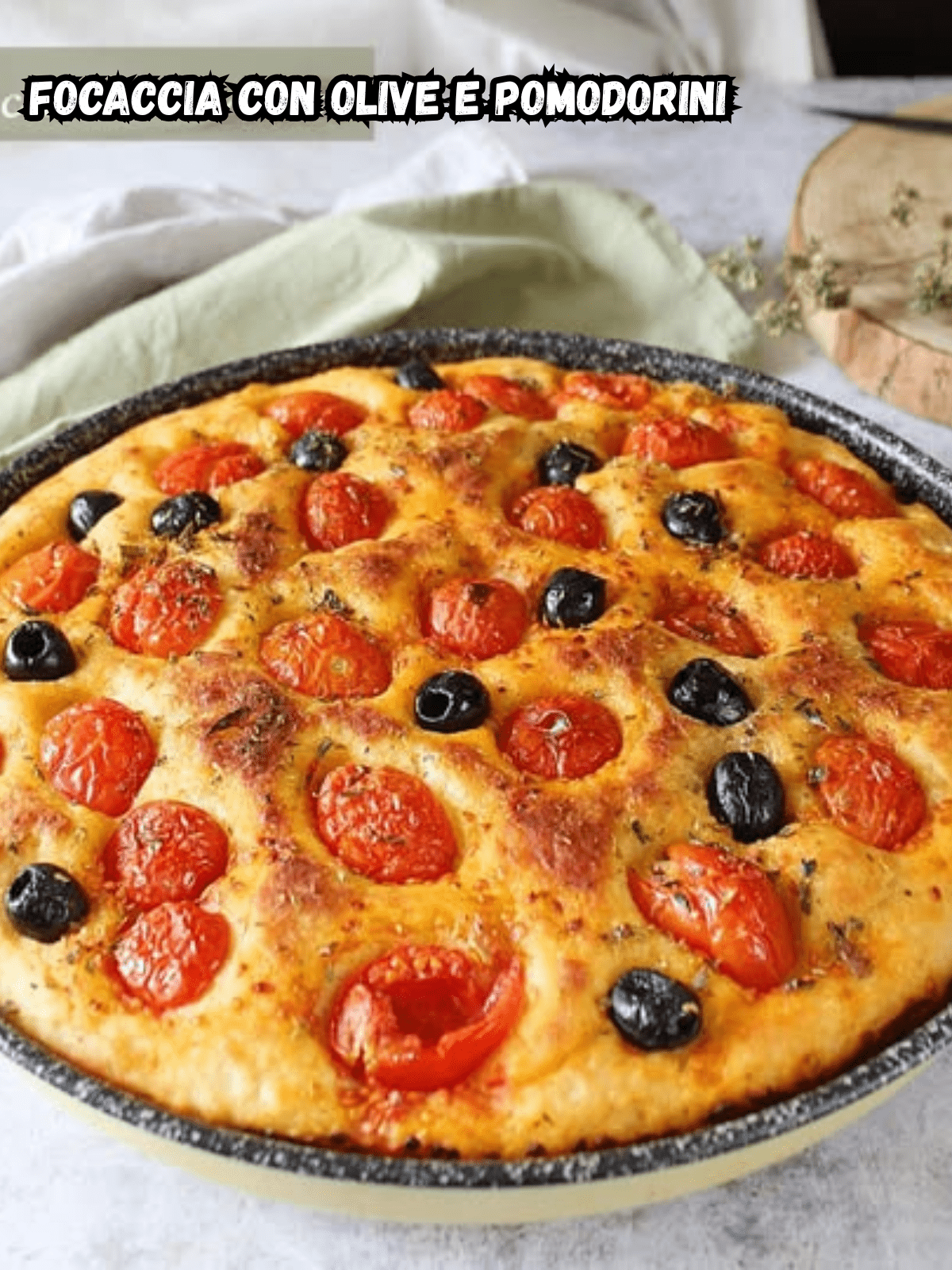 Alta, soffice e punteggiata in superficie da olive nere e pomodorini succosi, questa focaccia è una vera coccola da condividere in famiglia o con gli amici. Un impasto semplice che non richiede particolari abilità ma solo un po’ di pazienza per la lievitazione e tanto olio buono, quello extravergine d’oliva, da versare generosamente sulla superficie prima della cottura.