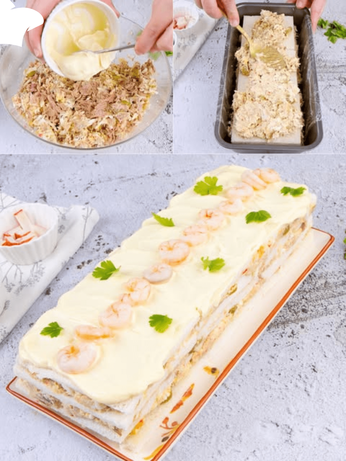 La torta tramezzino è un antipasto freddo facile, veloce e di grande effetto. Si tratta di un piatto senza cottura che si prepara alternando strati di pane morbido per tramezzini a una farcitura cremosa e saporita. In questa versione, la farcitura è a base di tonno, surimi, maionese, uova sode e gamberetti cotti, con un tocco di olive verdi e prezzemolo tritato.