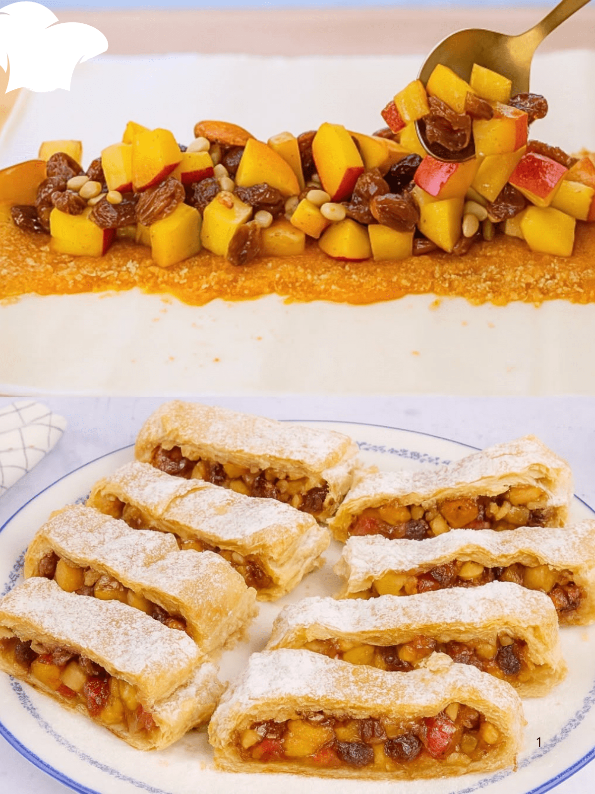 Lo strudel alle pesche è un dolce estivo semplice e delizioso, perfetto per sfruttare la frutta di stagione e portare in tavola un dessert leggero e profumato. Si tratta di una variante fresca del classico strudel di mele della tradizione trentina, ma con un ripieno a base di pesche fresche, marmellata, uvetta, pinoli, zucchero e cannella, il tutto racchiuso in un guscio di pasta sfoglia croccante. È un dolce versatile che puoi servire tiepido o a temperatura ambiente, accompagnato da gelato alla vaniglia, panna montata o crema pasticciera, ideale per una merenda golosa o come fine pasto.