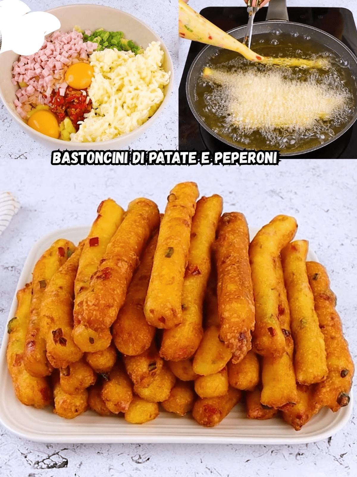 I bastoncini di patate e peperoni sono un antipasto sfizioso e dal gusto avvolgente, perfetto per iniziare un pranzo in famiglia o per arricchire un buffet durante un aperitivo. Croccanti fuori e morbidi dentro, si preparano con un impasto a base di patate lessate, peperoni rosolati, formaggio filante e prosciutto a cubetti, il tutto amalgamato con uova e amido di mais per una consistenza compatta e modellabile.