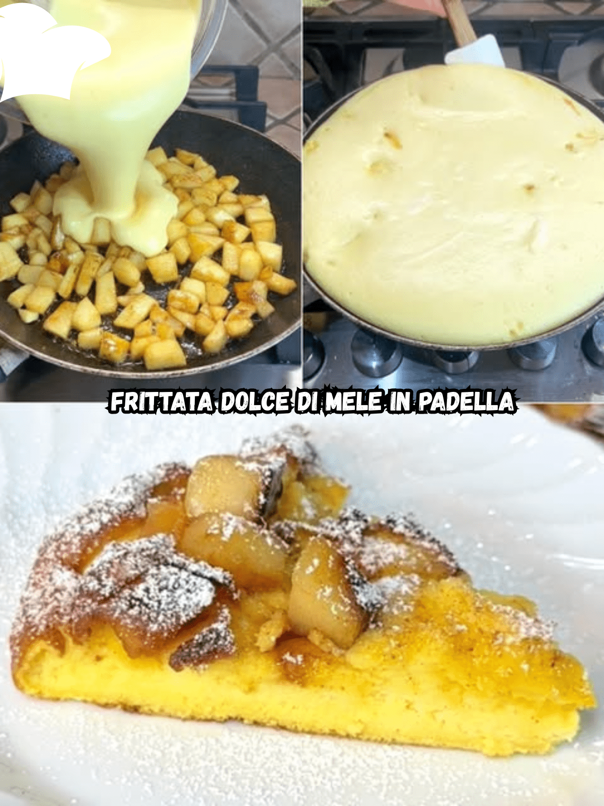 Questo dolce ha la consistenza morbida di una torta e il fascino rustico delle ricette della nonna. La cottura in padella lo rende ancora più veloce e pratico, senza bisogno di accendere il forno. Il risultato? Una frittata dolce alta, soffice e dorata, con cubetti di mela caramellati all’interno e una leggera spolverata di zucchero a velo sopra. Irresistibile.