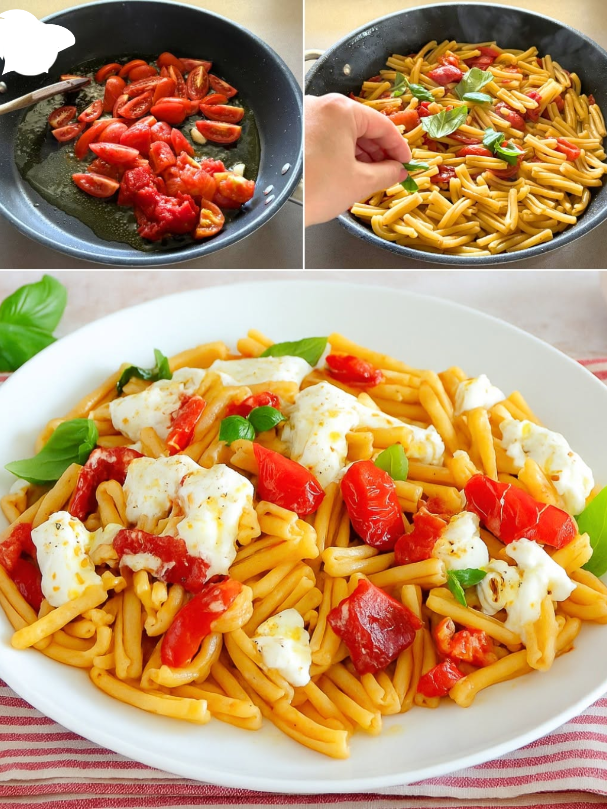 Le caserecce, con la loro forma avvolgente, catturano perfettamente il condimento a base di pomodori, aglio e basilico fresco, mentre l’aggiunta finale della burrata a crudo regala al piatto una nota fresca e cremosa che conquista al primo assaggio. Una spolverata di pepe macinato al momento, un filo di olio extravergine di oliva di alta qualità e il piatto è pronto per essere gustato in tutta la sua semplicità ed eleganza.