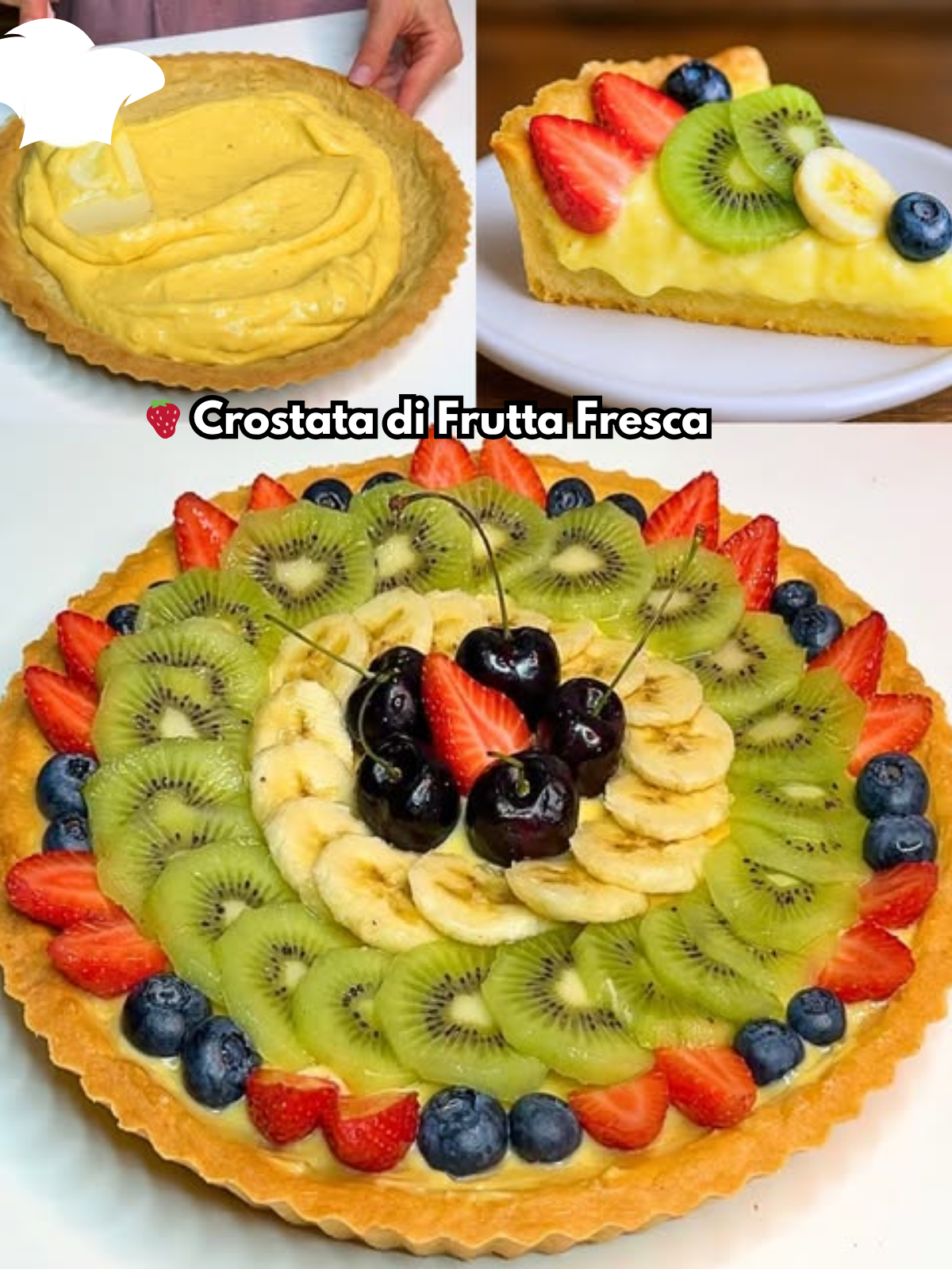 Questa crostata unisce tre elementi fondamentali: una base di pasta frolla friabile, una vellutata crema pasticciera e una ricca decorazione di frutta fresca disposta a raggiera, che dona al dolce un aspetto elegante e invitante. Il tocco finale è dato dalla gelatina alimentare che, oltre a rendere la frutta brillante, ne preserva la freschezza.