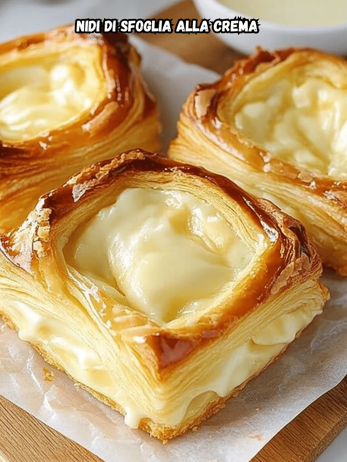 Immagina un morso in un dolce caldo e profumato, dove la sfoglia croccante e fragrante si fonde con un cuore vellutato di crema pasticcera alla vaniglia. I nidi di sfoglia alla crema sono piccole opere d’arte da pasticceria: eleganti, soffici, incredibilmente stratificati. Ogni strato nasconde il lavoro della sfoglia ben fatta e la dolcezza avvolgente della crema, che fuoriesce appena sotto la pressione del cucchiaino.