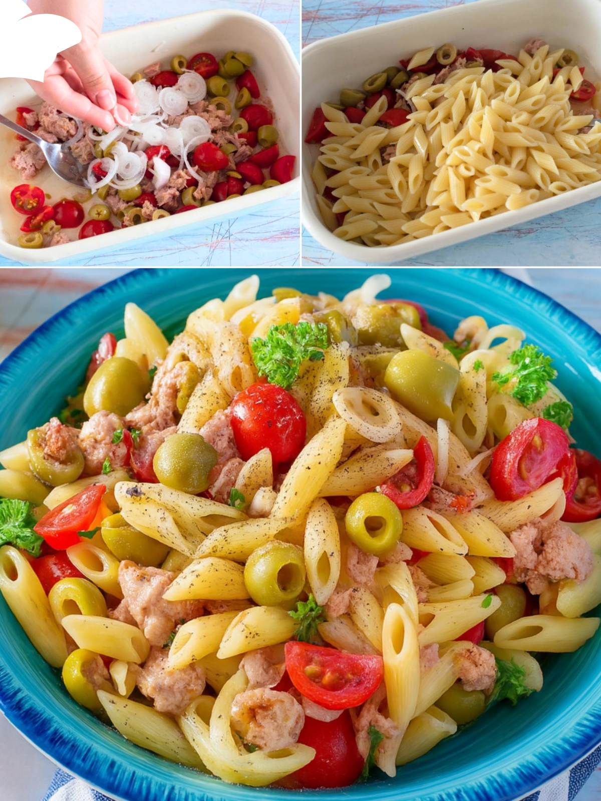 La pasta fredda con limone, olive e tonno è un piatto unico, gustoso e leggero, ideale da servire nei mesi più caldi. Perfetta per un pranzo veloce, una cena leggera, un picnic all’aria aperta o una giornata al mare, questa ricetta si distingue per la sua semplicità e per la combinazione equilibrata di sapori mediterranei. La freschezza del limone si sposa perfettamente con la sapidità del tonno e delle olive, mentre i pomodorini e il cipollotto donano una nota aromatica e croccante. Il tutto è condito con una emulsione di succo di limone e olio extravergine di oliva, che rende il piatto digeribile, senza appesantirlo con salse elaborate.