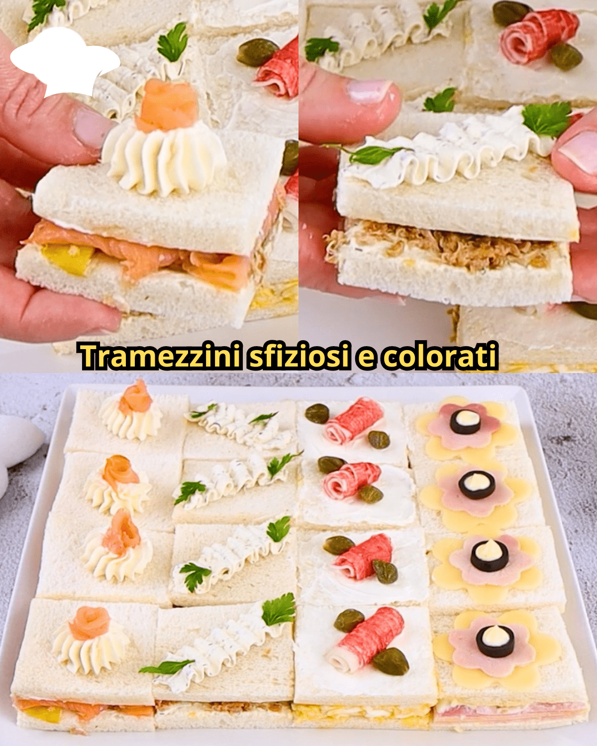 I tramezzini sono una delle preparazioni più versatili e amate: morbidi, golosi e facilissimi da realizzare, si prestano a mille varianti. Perfetti per un buffet, un aperitivo tra amici o una cena estiva leggera, hanno il vantaggio di poter essere preparati in anticipo e serviti con grande effetto scenografico. In questa ricetta ti proponiamo quattro farciture originali e bilanciate, che uniscono sapori delicati e freschi a contrasti più decisi: salmone e mango, tonno e formaggio alle erbe, prosciutto e formaggio, surimi e uova sode.