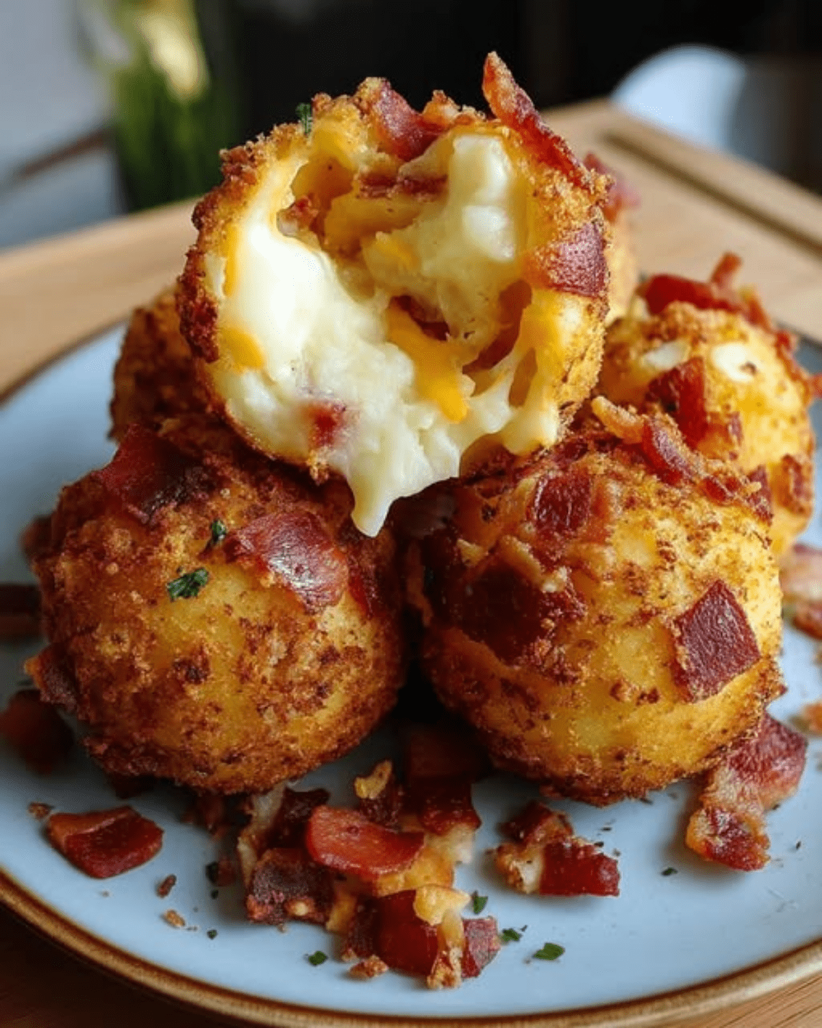 Immagina sfere dorate che scricchiolano sotto i denti, cedendo il passo a un interno soffice di purè avvolto da cubetti di pancetta rosolata e un cuore di cheddar filante. Ogni boccone è un perfetto equilibrio tra morbidezza, sapidità e la gioia di un formaggio caldo che si allunga in strisce golose.